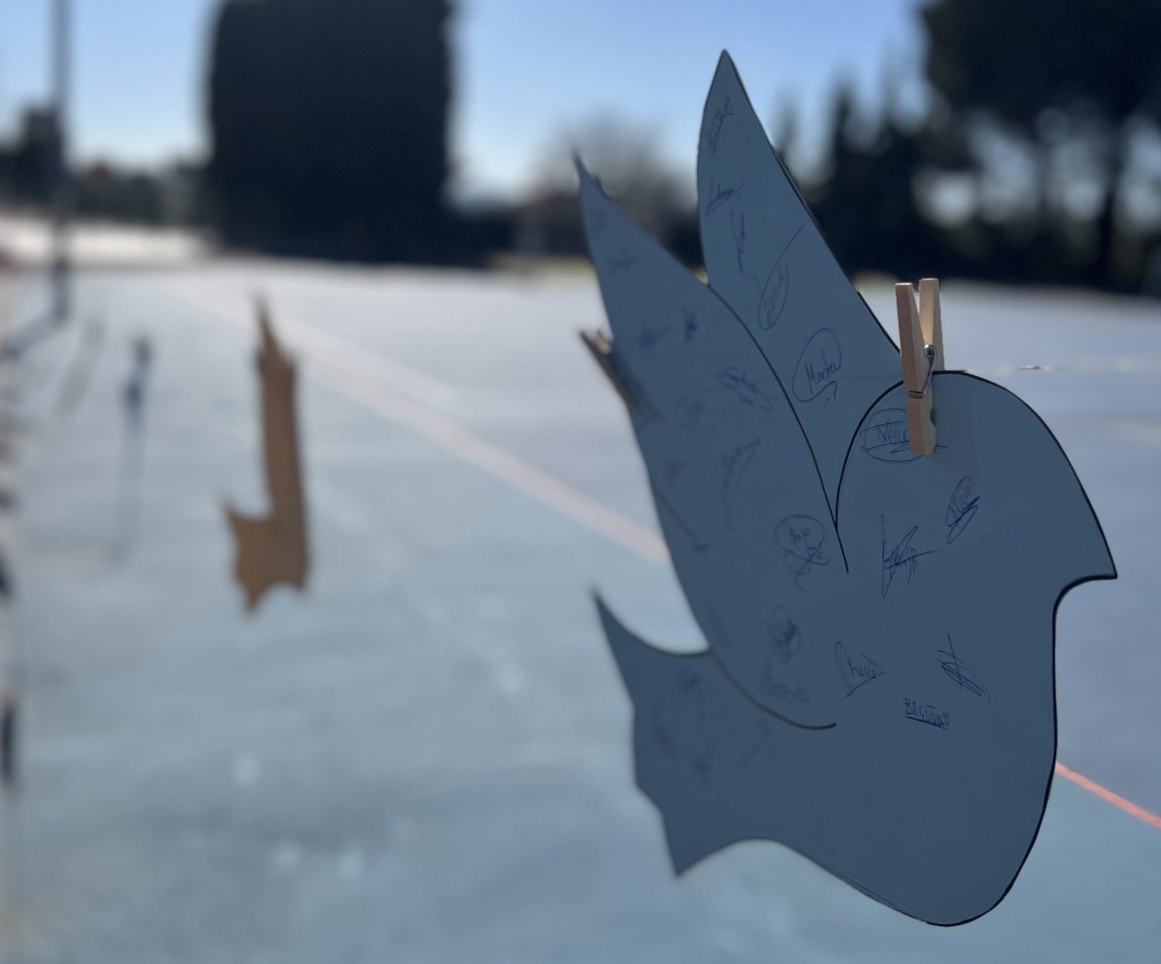 La actividad principal se ha desarrollado entre las 11:30 h y las 12:30 h, y ha contado con un acto simbólico en el que padrinos y ahijados han escrito sus nombres en una gran paloma de la paz, como muestra de su compromiso. Los estudiantes de 2o de Bachillerato, acompañados por sus ahijados, han leído el manifiesto de la paz, momento en el que cada grupo ha colocado su paloma en el centro de la pista.