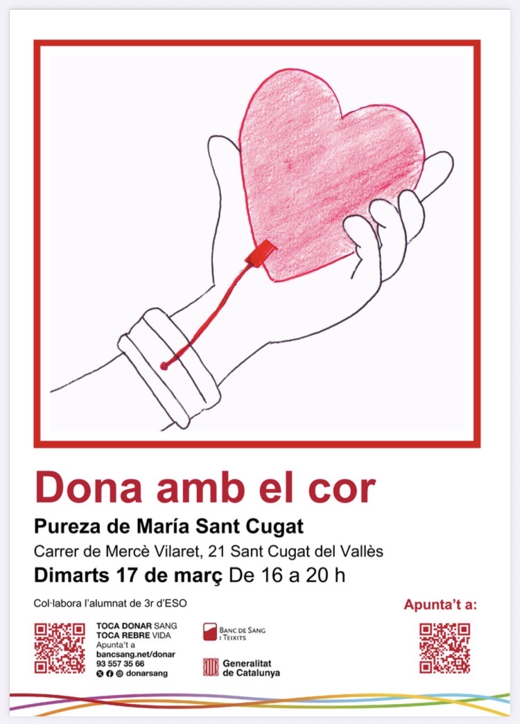 El passat dimarts 17 de març, de 16 a 20 h, l’escola Pureza de María Sant Cugat va acollir una jornada de donació de sang, organitzada amb la col·laboració del Banc de Sang i Teixits i impulsada per l’alumnat de 3r d’ESO.